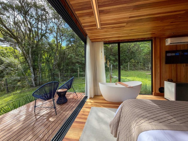 Lugar para descansar, conexão com a natureza. Nossa experiência foi excelente. Uma recepção lindíssima, de muito bom gosto, muito aconchegante, com uma vista linda. A Cabana impressionou, os detalhes chamam a atenção, tudo feito com muito capricho e bom gosto. Ambiente limpíssimo. Fomos atendidos pelos donos e a gerente, a expectativa e preocupação pela nossa satisfação era muito evidente e isso nos cativou muito. O café da manhã é servido no espaço da recepção e confesso que o café surpreendeu minhas expectativas, café servido em 4 etapas, tudo quentinho e muito gostoso, um dos melhores cafés que eu já tomei. Super recomendo e vamos voltar. O lugar foi tão especial para nós que não sentimos necessidade de fazer um tour pela cidade, ficamos para aproveitar bem a cabana e o lugar tranquilo.