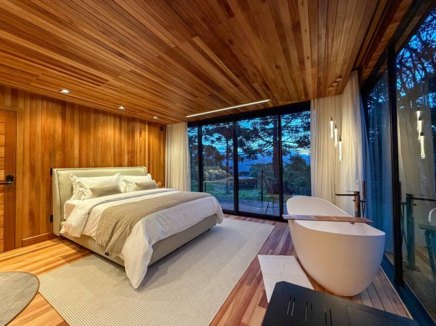 Controle o clima e a iluminação via Alexa, integrando a modernidade à rusticidade elegante da madeira.